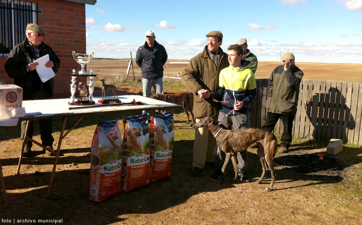 Leandro Sánchez (dcha.) y su perra "Troya" recibiendo el 3º Premio del Campeonato de Galgos 'Copa Ayuntamiento' de manos de Félix Duva (directivo del Club Deportivo de Cazadores de Nava del Rey).